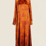 Vestido de gasa de largo midi con estampado de flores, cuello halter y anudado al cuello. Tiene manga larga que se ajusta con un botón en el puño. Cuenta con forro interior en punto de seda para una mayor comodidad.