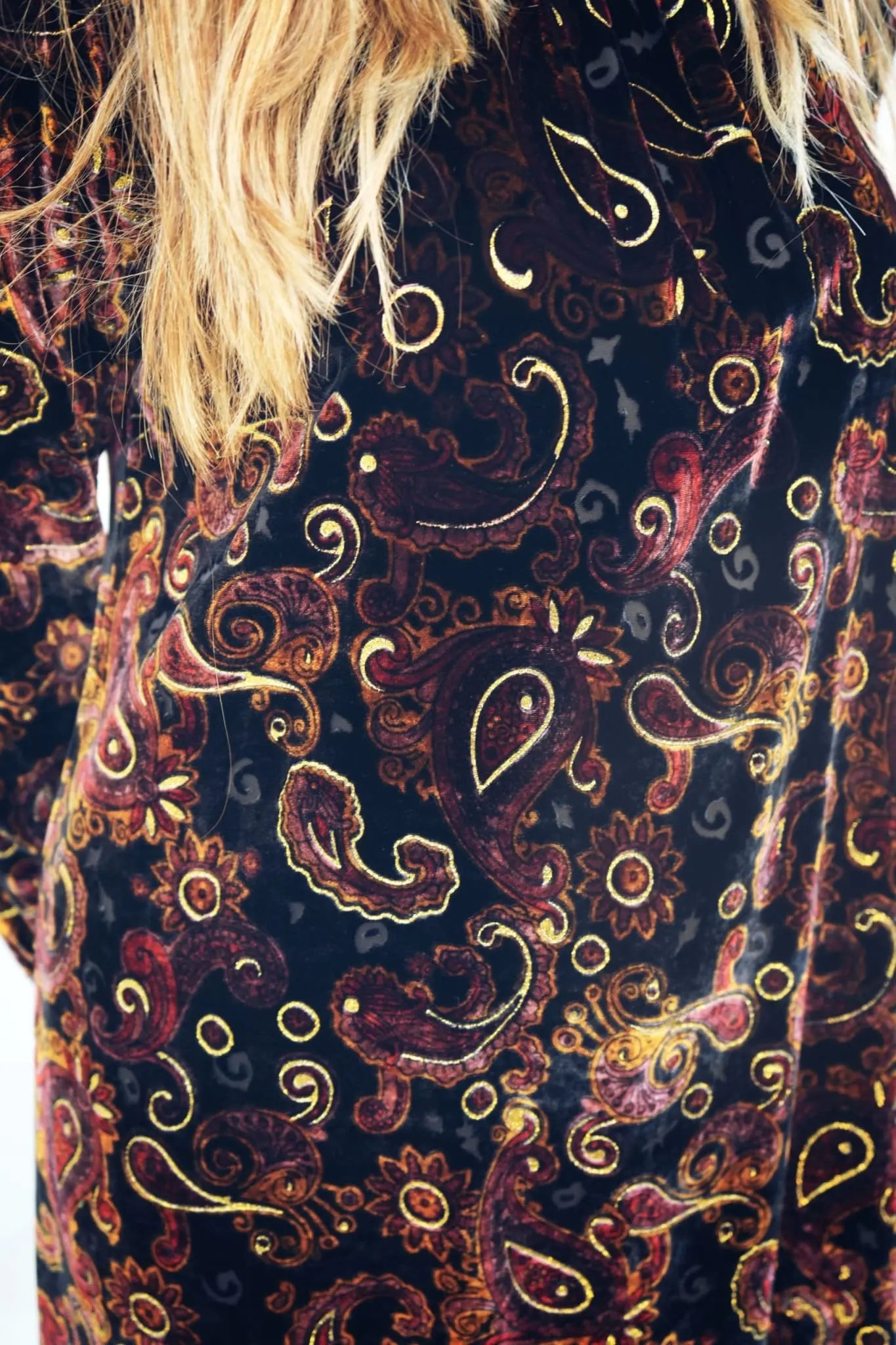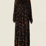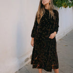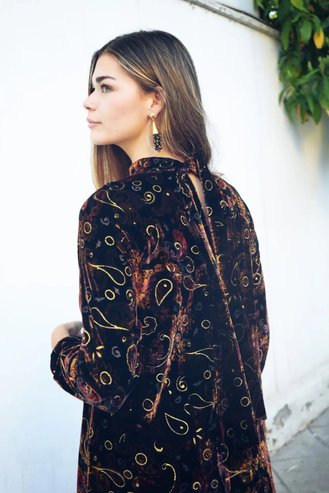 Vestido liso midi de terciopelo con manga larga y anudado al cuello. La manga se ajusta con fruncido en la muñeca. Abertura trasera en la espalda.