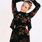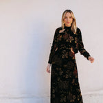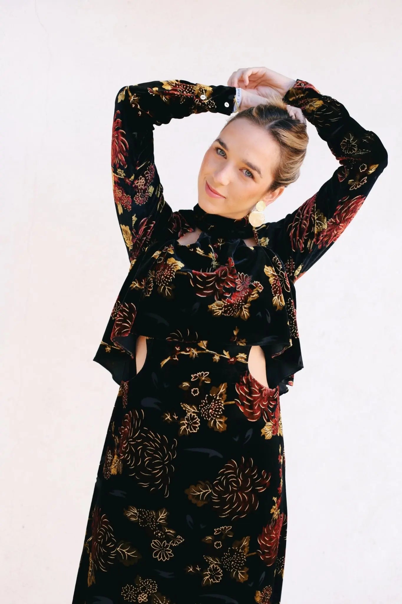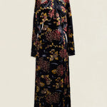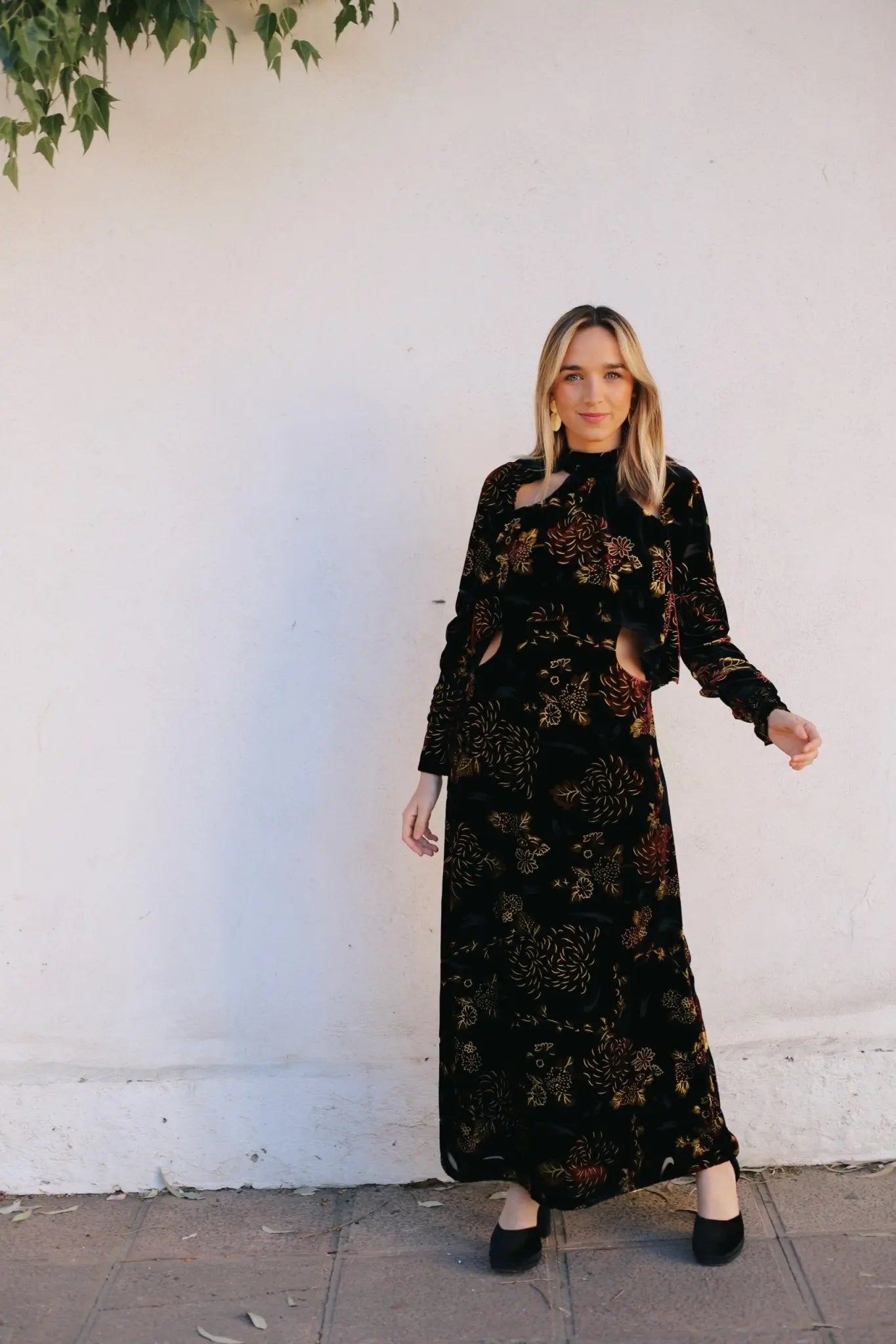 Vestido largo de terciopelo con manga larga, aberturas en la clavícula y en la cintura y anudado al cuello. La manga se ajusta con fruncido en la muñeca.